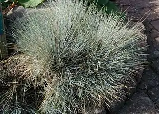 Bladene er oprette til svagt overhængende, hvilket kan gøre tuen lidt åben i midten. Blomsterskuddene er betydeligt højere end bladtuen, og de bærer nikkende, blåviolette toppe af græs-”blomster”. Efter modningen af frøene gulner stråene. Frøene spirer villigt.