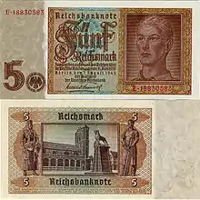 For- og bagside på en 5-Reichsmark-seddel fra 1942