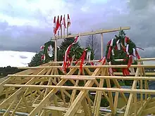 Nybygningen pyntes med en stang med normalt en til tre kranse. Kransene er bundet af grønt og smykket med blomster eller kulørte bånd. Dannebrog ses ofte øverst på stangen. Kransene kan enten hænge vandret eller lodret. I den østlige del af landet hænger de oftest vandret. Håndværksmestrene sørger for kransene, og bygherren bekoster gildet for alle, der har deltaget i byggeriet. Gildet holdes som regel om eftermiddagen som afslutning på arbejdsdagen. Man samles i nybygningen, hvor der serveres portvin og kransekage eller øl og smørrebrød. Under arrangementet taler både bygherre, arkitekt og mestre. Bl.a. afslutter man oftest talen med sætningen "Gid dette hus må bestå i så mange år, som dette glas går i skår" hvorefter man slår et glas itu mod et af husets vægge.