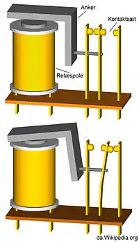 Et relæ består af en elektromagnet (solenoide), et anker og et større eller mindre antal kontakter.