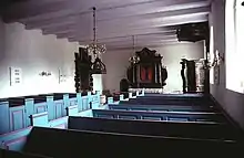 - Kirkens prædikestol er samtidig med altertavlen fra 1742.