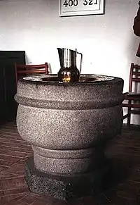- Af det oprindelige inventar findes kun den romanske døbefont med glat kumme under en rundstav, udført i granit. Det tilhørende dåbsfad er et sydtysk arbejde fra midten af 1500-tallet, i følge en indgravering dog først indført i kirken i 1622. Dåbshimlen er udført i regencestil ca. 1770.