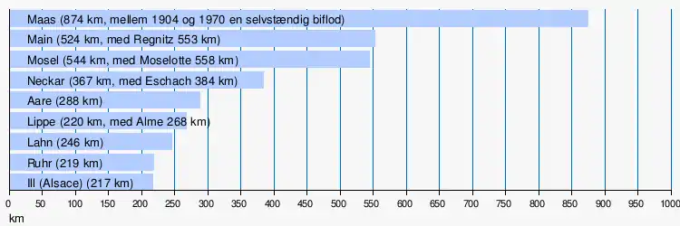 Efter Maas er de længste bifloder Mosel med 544 km (med Moselotte 558 km) og Main med 524 km (med Regnitz 553 km). Bifloder med en længde på mindst 200 km: Neckar, Aare, Lippe, Lahn, Ruhr og Ill (Alsace).