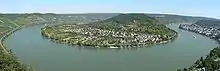 Ved St. Goarshausen ved et skarpt sving ligger Lorelei-klippen. Lorelei druknede sig af kærlighed og blev en havfrue. Hendes statue står på en landtange. Det siges, at hendes sang lokker sømænd i døden og får skibene til at kæntre. Her er floden 25 meter dyb. Det er det vanskeligste sted at passere på Rhinen.