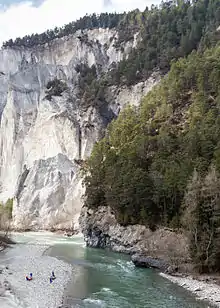 Ved Tamins-Reichenau løber Vorderrhein og Hinterrhein sammen til Alpenrhein. Alpenrhein er 90 km lang og falder 203 højde meter fra 599 til 396 meter over havet.[10] Den løber østover forbi Chur, som er hovedby for kanton Graubünden, og videre mod nord, hvor den danner grænseflod med først Liechtenstein og dernæst Østrig, før den til sidst løber gennem Østrig, hvor en 5 km lang kanal leder floden ud i Bodensøen.