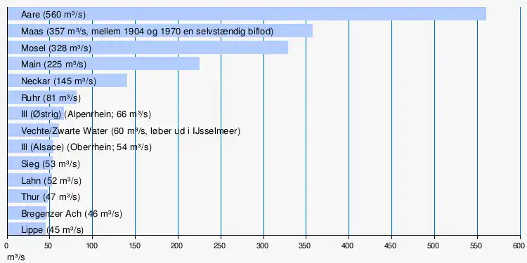 Bifloden Aare er den vandrigeste og den fjerdelængste biflod til Rhinen. Den afvander et stort område af Schweiz og bidrager med 560 m³/s, hvilket er mere, end hvad Rhinen selv bidrager med (470 m³/s). De øvrige vandrigeste bifloder er Maas (355 m³/s), Mosel (328 m³/s), Main (225 m³/s) og Neckar (145 m³/s).