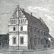 Huset bliver omtalt som to selvstændige huse i 1591 men i 1611 beskrives det atter under ét. I 1828 lå der en lille bindingsværkbygning i én etage op ad nordgavlen på rådshuset, som havde en port ind til den fælles baggråd.[6]