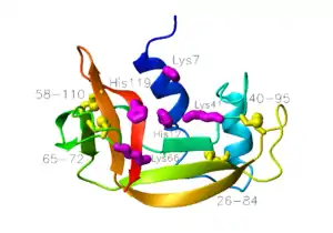 RNase A har fire difulfidbindinger i dets native form: Cys26-Cys84, Cys58-110, Cys40-95 og Cys65-72. De første to (26-84 og 58-110) er essentielle for konformationel foldning; hver enkelt binder en alfahelix i det ene lag til en betaplade i det andet lag, hvormed en lille hydrofob kerne dannes. De sidste to svovlbroer (40-95 og 65-72) er mindre essentielle for foldningen; enten den ene eller den anden kan reduceres (blot ikke begge) uden at det påvirker den native struktur under fysiologiske betingelser. Disse svovlbroer forbinder loop-segmenter og er relativt eksponerede for solvent. Svovlbroen 65-72 har en ekstraordinær høj tilbøjelighed til at dannes, specielt mere end hvad ville forventes af dets loop-entropi, både som peptid og som hele proteinet. Dette tyder på, at 61-74 β-hårnålen har stor tilbøjelighed til at folde konformationelt.