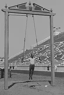 Et historisk foto med gymnasten Hermann Weingärtner i ringene.