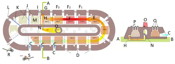 Ved forbrændingen (F) tilføres kul (P) og forbrændingen danner flammer med luftstrømmen. Røggassen fra forbrændingen (H) opvarmer og tørrer de tegl, som endnu ikke er brændt. Herved nedkøles røggassen, som via en røgkanal og en åben røglem (N) ledes til skorstenen (O).