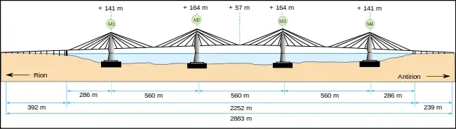 Den 2.880 meter lange bro forbinder Peloponnes med det græske fastland, som tidligere kun kunne nås med færge eller over Korinth-tangen i den allerøstligste ende. Dens bredde er 28 m, og den har to kørebaner i hver retning, et nødspor og et fodgængerspor. Dens femspand, fire pyloner store skråstags-understøttede del på 2.252 meter er verdens næstlængste skråstags-ophæng; kun ophænget på Millau viadukten er længere med 2.460 meter.
