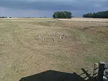 Udsigt over det arkæologiske anlæg i Rispebjerg. Træstubbene på billedet markerer stolpehuller.