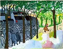 | ... som sædvanlig første Pinseda' stiller vi paa Runddelen og afsynger "Nu blusser Morgenrøden op, og Fuglene kvidre paa Grene" .. saa massere vi ne'r a'Pilealeen te' Søndermarken ... og saa vil vi ikke ha' Kællingerne med i Toget - nej - de ser alt for forskellige ud - de ska' gaa i Forvejen med Madkurvene og i det hele taget holde sig i Baggrunden....