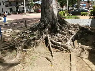 Rodhalsen er her det korte stykke mellem det lodrette stamme forløb og det vandrette rodforløb. Det er i øvrigt usædvanligt, at rødderne er blottet som her, og her skyldes det erosion som følge af trafik omkring stammen.