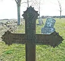 Korsformet gravmonument af støbejern med gravteksten indstøbt i korset