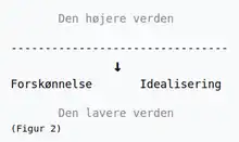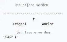 Det romantiske syn på forholdet mellem de to verdener kan illustreres ved figur 1. De to verdener er adskilt ved en stiplet linje. Herved illustreres det, at der ikke er en absolut grænse mellem dem. Det er i korte øjeblikke muligt at trænge fra den lavere verden op til den højere verden med al dens skønhed - for eksempel i oplevelsen af stor kunst. Længslen og anelsen findes hos mennesket i den lavere verden, og det retter sig mod den højere verden (illustreret ved pilen). Det, at mennesket har en længsel og en anelse, er tegn på, at det egentlig hører til i den højere verden.