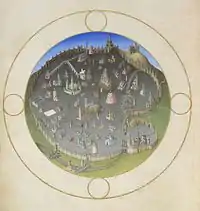 Simplificeret oversigtskort over byen Rom, illustration fra manuskriptet Très Riches Heures du Duc de Berry fra 15. århundrede.