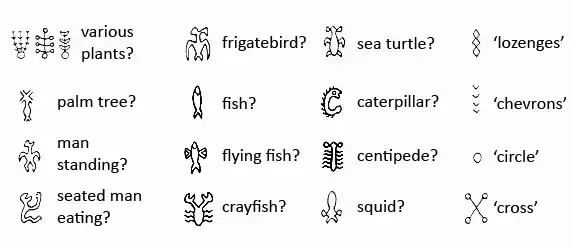 - Nogle af de mere ikoniske rongorongo-hieroglyffer. Den siddende mand (nederst til venstre) er antagelig vis en sammensat enhed.