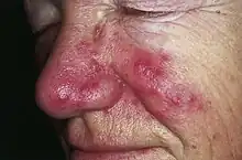 Sygdommens morfologiske kendetegn omfatter erythem, papler, pustler og teleangietasier.[2]