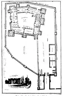 Plantegning over den gamle bygning fra Samuel Jefferson, History and Antiquities of Carlisle (1838).