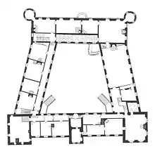 Selve hovedbygningen består af fire fløje, sammenbygget omkring en trapezformet borggård. Man byggede én fløj ad gangen, så byggeriet varede et halvt århundrede.