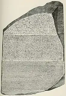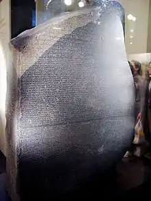 Rosettestenen er en mørk granitsten, der blev opdaget i Nildeltaet i juli 1799, under Napoleons felttog i Egypten. På stenen stod en tekst på to sprog: egyptisk og oldgræsk. Den var skrevet med tre skriftyper: egyptiske hieroglyffer, egyptisk demotisk og græsk. Da de to sidste allerede var kendte, blev stenen nøglen til dechifreringen af hieroglyfferne. Det skete i 1822 og skyldtes Thomas Young og Jean-François Champollion. Det muliggjorde oversættelse af tekster med hieroglyffer.