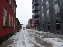 Opdelingen passede med, at de to gader fremover ville blive præget af vidt forskelligt byggeri. På begge sider af Billedvej og på den vestlige side af Rostockgade ligger der bevaringsværdige erhvervsejendomme i kvarteret Den røde by, der som navnet antyder overvejende er røde, og som har fået lov at blive stående.[1] Langs det meste af den vestlige side af Rostockgade står der således en gammel aflang erhvervsejendom, der ligesom de andre røde bygninger i sin tid tilhørte Riffelsyndikatet. Under Besættelsen producerede de våben til den tyske besættelsesmagt. 22. juni 1944 blev den aflange bygning imidlertid sprængt af modstandsgruppen BOPA og arbejdere fra fabrikken ved en spektakulær sabotageaktion. De trodsede to hegn og fik afvæbnet de otte vagtposter i området en efter en. Desuden blev trafikken på den nærliggende S-bane stoppet umiddelbart før eksplosionen. Efterfølgende slap de væk med to lastbiler fyldt med våben fra fabrikken.[2] Efter besættelsen havde bygningen forskellige funktioner. I 2017-2018 blev den ombygget til brug for et Meny-supermarked. Her er der opslag med tekst og billeder, der fortæller om bygningens historie.[3][4]