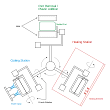 Rotationsstøbemaskiner laves i mange forskellige størrelser. De består normalt af 1 til 3 arme, en ovn og en kølezone. På armene monteres de forme som er nødvendige for at fremstille det ønskede plastemne.[3]