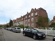Bemærk afslutningen mod Haraldsgade. Det er en lidt sjov vinkel arkitekten har valgt at ’skære’ husene af med, og det viser at selv byggeriet er flot, så var der også tænkt på omkostningerne: Røde, flotte og dyre mursten ud til gaden. Gule billigere mursten, der til gengæld ikke ældes så smukt, ud til gården.
