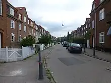 Nr. 44 gemmer sig bag et brunligt flethegn, hvilket stikker lidt ud i forhold til de hvide stakitter der ellers præger gadens haver.