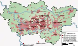 Til Ruhr-distriktets byer tæller man de nu sammenvoksede større byer Bochum, Bottrop, Dortmund, Duisburg, Essen, Gelsenkirchen, Hagen, Hamm, Herne, Mülheim an der Ruhr og Oberhausen, der udgør ca. 4.435 kvadratkilometer. Tilsammen bor der i dette område omkring 5,3 millioner indbyggere, hvilket gør distriktet til det største sammenhængende byområde i Tyskland og det fjerdestørste på EU-plan efter Paris, London og Madrid.
