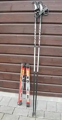 Stavene bør have samme længde som til langrend, men spidserne skal være lavet af hærdet stål med henblik på at nedsætte slitagen samt sikre tilstrækkeligt "greb", når der løbes på asfalt. I forbindelse med træning og konkurrence kan der anvendes forskellige former for beskyttelsesudstyr, såsom hjelm, knæbeskyttere, albuebeskytter og bukser med med stødabsorberende indlæg. Tøj/sko med reflekser yder en sikkerhedsmæssigt forebyggelse, hvis der skal trænes i trafikken.