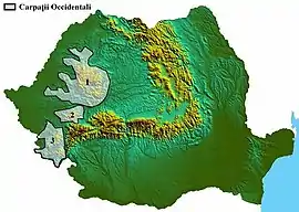 - Vestrumænske Karpater (Carpații Occidentali Românești) - med 3 hovedgrupper opdelt i 18 bjerggrupper
