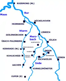 Større bifloder til floden Rur er Inde og Wurm. Byerne langs Rur er Monschau, Heimbach, Nideggen, Düren, Jülich, Linnich, Hückelhoven, Heinsberg (alle i Tyskland) og Roermond (Holland).