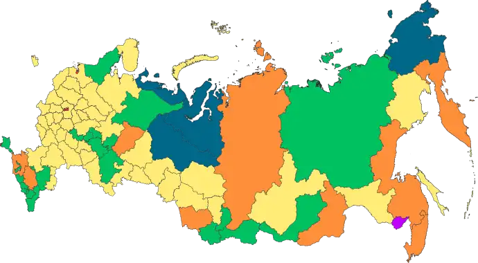 | 9 krajer (dansk: ~ territorier) (russisk: края, tr. kraja; ental край, tr. kraj) — meget lig oblaster , men ligger ofte i periferien, og er tyndt befolket. | |
