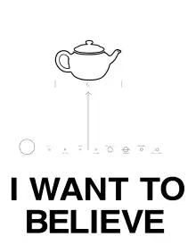 | Hvis jeg fremførte, at der mellem Jorden og Mars skulle findes en porcelænstepotte, som kredser om Solen i en elliptisk bane, da ville ingen kunne modbevise mit udsagn, forudsat at jeg var omhyggelig med at tilføje, at tepotten er for lille til at kunne ses med selv vores kraftigste teleskoper. Men hvis jeg fortsatte med at sige, at eftersom mit udsagn ikke kan modbevises, er det uacceptabelt overmod fra den menneskelige forstands side at forsøge at betvivle det, da skulle jeg med rette anses for at vrøvle. Hvis eksistensen af en sådan tepotte derimod var bekræftet af antikke bøger, forkyndt som den hellige sandhed hver søndag og indprentet i børns hjerner i skolen, da ville tøven med at tro på dens eksistens blive opfattet som et udtryk for excentricitet, og tvivleren ville vække opmærksomhed hos psykiatere i en oplyst tid eller inkvisitorer i en tidligere. | ||