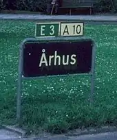 - Europaruter, der (som tidligere) var angivet med bogstavet E+nummer med hvid tekst på grøn baggrund og med hvid ramme. Danmark har i dag fem E-ruter.