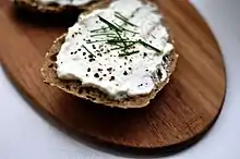 Tynde rugbrødsskiver og kyllingeskind med rygeost og kaviar.
