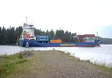 Et containerskib passerer Södertäljeledens smalleste sund, Brandalsund.