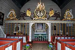 I kirkeskibet hænger et vævet alterbilde eller antependium fra 1632. Den gamle altertavle hænger nu nede i kirkeskibet; motivet er den sidste nadver