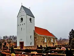 - Kirken består af skib og kor, tårn mod vest. og våbenhus mod syd. Skib og kor, med fladt loft, ere opført i overgangsstil af rå og kløvet granit. Syddøren, korbuen og tre vinduer ere bevarede. I den senere middelalder opførtes tårnet, hvis hvælv. Underrum har rundbue ind til skibet, af munkesten (restaur. 1789, med bogst. CVLS-HVL). Våbenhuset, af (nytidens) mursten, er vistnok fra 19. årh. Altertavle i barokstil med et nyt maleri (den korsfæstede). Bægerformet romansk granitdøbefont. prædikestol i renæssancestil. Paa et af stolestaderne årstal 1699. Klokken, med indskr. i minuskler, er fra 15. århundre.