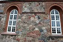 Sydsiden af tårnmuren, er forsynet med en del jernankre, hvoraf nogle gengiver forskellige navnetræk. Øverst er Christian 7.’s monogram, derefter amtmand von Ahlefeldts, provst Strodtmanns og pastor Jessens. Nederst ses kirkeværgerne Simon Uldalls og Jep Hansen Becks initialer. Kirkens nordside er bevaret i den oprindelige romanske stil med med de typiske rundbuede vinduer, men en kvindedør i skibets nordvæg er dog muret til. Sydsiden opført i forskellige materialer og fik ved en stor istandsættelse i 1869, de store vinduer. Skibet er bygget af kløvede farvede kampesten. Tårnet blev opført af munkesten i slutningen af 1400-tallet. 1806 blev tårnets sydmur samt halvdelen af muren mod vest nedbrudt og erstattet med almindelige mursten.Ved en hovedistandsættelse i 1869, der blev ledet af L.A. Winstrup, blev korbuen fjernet og bjælkeloftet underklædt med fladt gipsloft med stukdekorationer.[1]