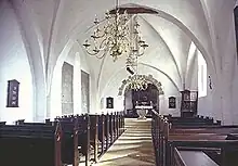 Kor og skib har fået indbygget ottedelte hvælv i gotisk tid, apsiden har ikke halvkuppelhvælv men et krydshvælv, hvilket underbygger teorien om, at apsiden er tilføjet senere af materialer fra en nedbrudt kirke. Den runde korbues stik er bevaret, men formodentlig er buen noget omsat. Tårnrummet blev ombygget til gravkapel i 1700-tallet, i 1735 fik tårnbuen stukportal med smedejernsgitter. Altertavlen er en lutheransk fløjaltertavle fra slutningen af 1500-tallet, i 1700-tallet blev malerierne indsat og tavlen fik topstykke med våben for Christian Frederik von Levetzau og hans første hustru Christence Lindenov Rantzau. Prædikestolen dateres til omkring 1550 og bærer våben for Gabriel Gyldenstjerne og Kirsten Friis, i felterne ses scener fra Passionen i relief. På den gamle dørfløj mellem våbenhuset og skibet er bevaret et låsebeslag i romansk stil, dateret til omkring 1250, øverst på beslaget ses en bygning med tre rundbuede arkader og dragehoveder ved tagets gavle.