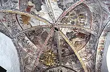 Det øverste bånd i korets ottedelte hvælv har motiver fra 1. Mosebog. I østkappen ses mod nord Adskillelsen af lys og mørke samt Lucifers nedstyrtelse, mod syd ses Gud velsigne den skabte jord, i fligene under våbenfrisen fortæller teksten, at disse våben er for Kirsten Friis og Gabriel Gyldenstjerne. Bag alteret ses en efterreformatorisk Dommedagsfremstilling på østvæggen. Kristus sidder ikke tronende men står omgivet af engle og en skykrans. De fortabte jages ned i Helvedesgabet, hvor en djævel trækker dem ind. De frelste svæver op i Himlen, nogle er allerede forsvundet ind i den sky som adskiller Himmel og Jord, men her er ingen Himmelborg som modstykke til Helvedsgabet. I sviklerne ses våbenskjolde for Gabriel Gyldenstjerne og Kirsten Friis. Dommedagsfremstillingen på østvæggen flankeres af Korsfæstelsen og Opstandelsen i den sydlige hvælvkappes flige samt de gammeltestamentlige præfigurationer Kobberslangen og Jonas udspyes af hvalfisken i den nordlige kappes flige.