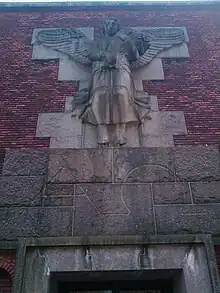 Over indgangspartiet til det store kapel findes et relief af billedhuggeren Einar Utzon-Frank. Reliefet viser en engel med neg over en sokkel med det kristne symbol alfa og omega. Indgangpartiet og relieffet er hugget i bornholmsk granit.[4]