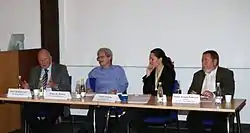 ![]() SK's forsvarskonference på Kastellet i København 6. november 2008. Fra v.: MF Jens Chr. Lund, MF Holger K. Nielsen, journalist Paula Larrain og daværende formand for Søværnets Konstabelforening Bjarne Krogh-Pedersen. | |