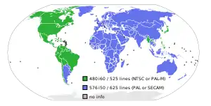 SDTV-opløsning fordelt efter land; af historiske årsager anvender forskellige lande enten 480i eller 576i som deres almindelige opløsnings billedformat.
