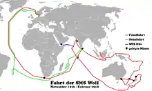 Skibet gennemførte i 1916-18 et togt gennem Atlanten, Stillehavet og det Indiske ocean, hvor hun opbragte og sænkede 14 handelsskibe, ligesom mindst 13 skibe blev sænket af miner udlagt af Wolf. Efter at have opbragt fremmede handelsskibe bemægtigede Wolf sig det opbragte skibs last, herunder kul, men også råvarer i form af metaller, som var vigtige for den tyske krigsindsats. Handelsskibenes besætninger blev taget som krigsfanger og interneret på Wolf og det opbragte skib sænket. Under togtet, der var det længste, der blev gennemført af noget krigsskib under første verdenskrig, sænkede Wolf mindst 27 skibe med en samlet tonnage på ca. 110.000 tons. Efter togtet vendte hun tilbage til flådebasen i Kiel med et omfattende krigsbytte og adskillige krigsfanger.