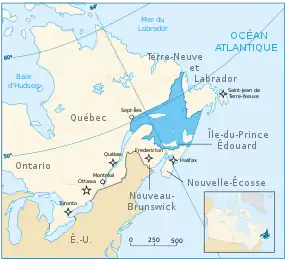 Saint Lawrence-floden, som kommer fra De store søer, har udløb inderst i bugten. I Saint Lawrence-bugten ligger de store øer Anticosti Island og Prince Edward Island, og den mindre øgruppe Îles de la Madeleine. Yderst mod havet ligger den franske øgruppe Saint-Pierre-et-Miquelon.