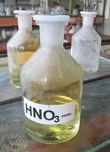 Salpetersyre er en stærk syre; en vandklar, farveløs og stærkt ætsende væske. I vandige opløsninger dissocieres så godt som alle salpetersyremolekyler i nitrationer og hydrogenioner. Salte af salpetersyre kaldes for nitrater, og næsten alle disse nitrat-salte er opløselige i vand.